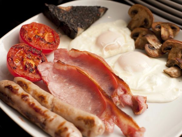 Local Farm Sausage and Back Bacon, Tomato, Mushrooms and Fresh Farm Eggs prepared to your liking.